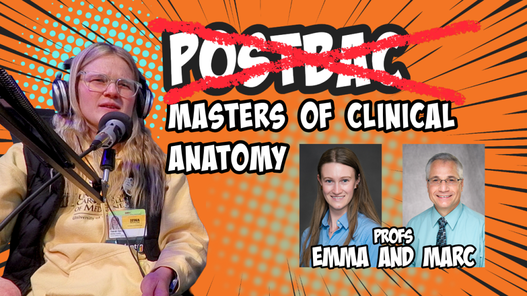 Postbac programs are okay, but what if there was another path to medical school? M2s Sarah Upton, Alec Marticoff, and Kevin Gubner host the program directors of the Carver College of Medicine’s Masters of Clinical Anatomy Program. Interestingly, each co-host decided to get a MCA to make up for some shortcomings in their med school applications, whether it was soft a GPA or a lack of applicable hard science education.